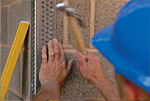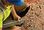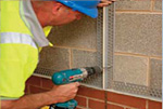 On blockwork, beads are set onto render dabs to the required depth and plumbed straight. Adhesive mortar can also be used for faster drying and to prevent slipping. Larger profiles, particularly wide wing beads, can be fixed with non-corrosive mechanical fixings alone as the flexible wings take up irregularities in the background, with the strong arris remaining straight. Nail clouts or hammer-in plug fixings are suitable for this.